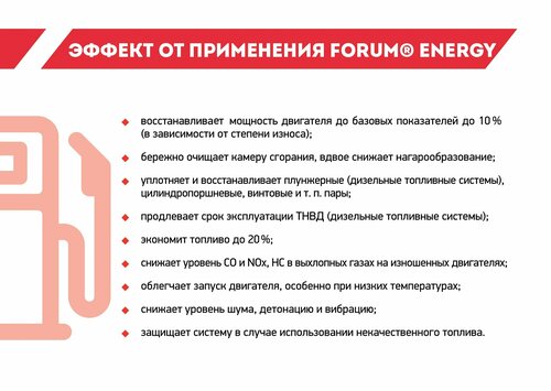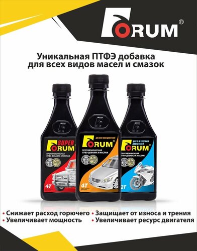 Добавки Forum® полностью совместимы со всеми типами масел, смозок и видами топлива.